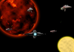 convoi de vaisseaux marchands, certains armés d'autres non, et de deux chasseurs, un intercepteur et un bombardier (plusieurs vagues).