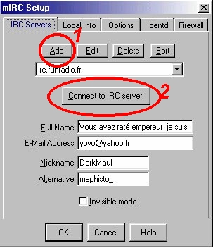 Faites OK, Puis cliquez sur Connect to IRc Server (2) , Voila maintenant, vous choisissez votre channel de discussion, pour L'Antre de Yoda c'est #ady, si il n'est pas dans la liste cliquez sur Add puis cliquez sur Join Les aides à l'instalation proviennent du site IRC jedi, je les en remercie. |