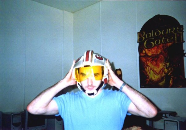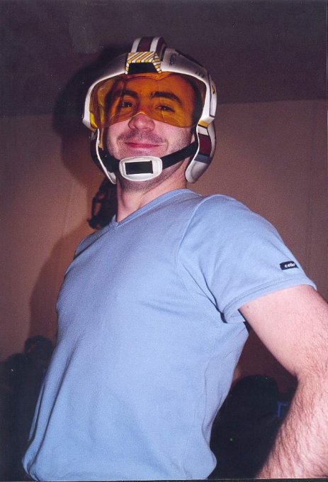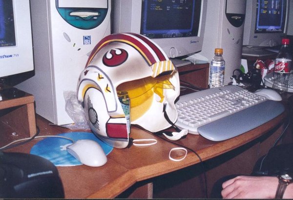 Corran enfile le casque de pilote rebelle de wamba. Vu la chaleur qui régnait dans la salle, il n'a pas du le garder bien longtemps.