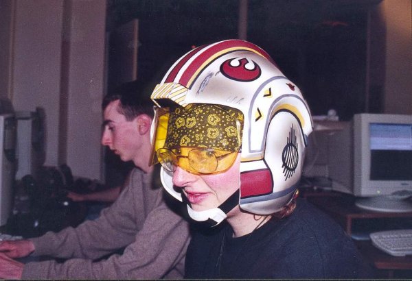 La pirate Wamba avec son casque de pilote rebelle volé à une de ses victimes. Dark Bane en second plan essaye de faire fonctionner ce %$@% de jeu.