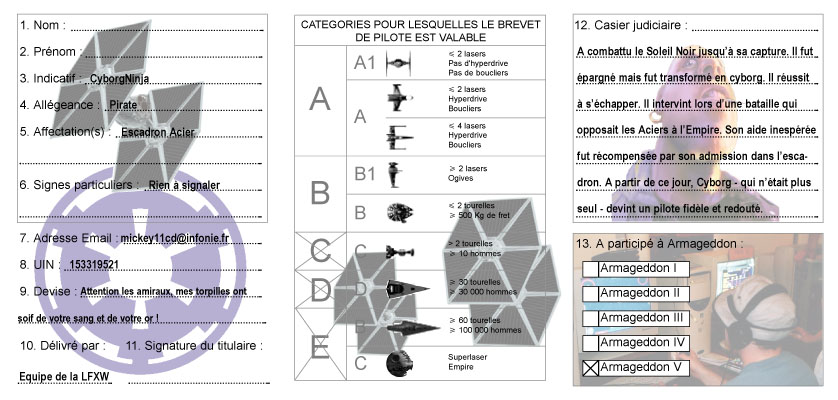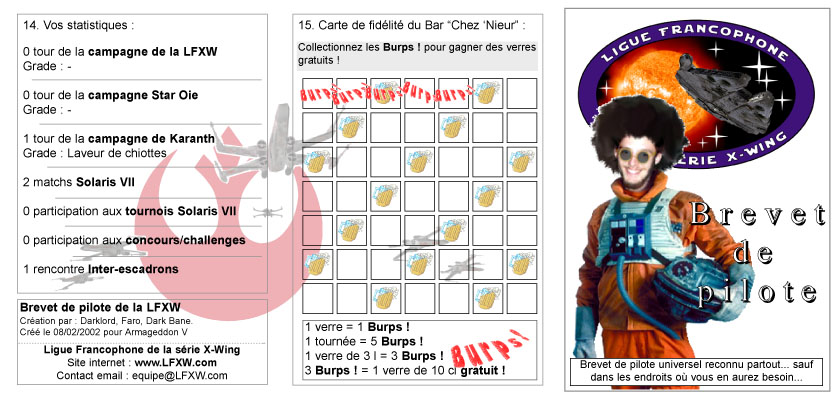Dark Bane prend bientôt la parole pour présenter la surprise de la soirée : des brevets de pilotes ! Les brevets sont distribués à chacun accompagnés d'un autocolant de la Ligue. On se les échange, on s'amuse à lire les textes des autres, on compare...