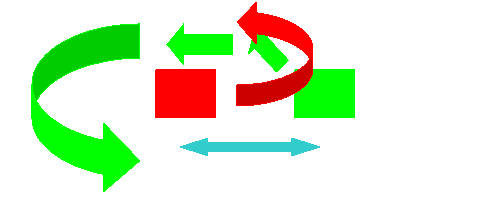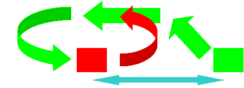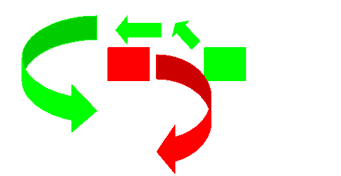 En vert, ils s'agit de vous, en rouge l'adversaire. Les flèches vertes représentent les trajectoires. Il s'agit la de la première possibilité, la seconde étant plus dure à faire. Voici le cas face à des pilotes expérimentés. Là, il vous faut faire quasiment trois quart de tour, avant d'avoir un face à face, sachant que l'adversaire aura peut-être un léger retard sur vous (s'il est surpris):